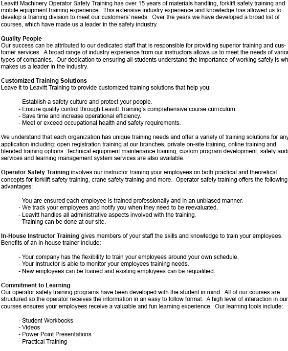 The substantial assortment of start times and programs we provide should make sure that you find the perfect match for your needs. Instruction can be performed at our site or at your facility. Our aptitude to tailor our training methods to your equipment is what sets us apart from our competition.